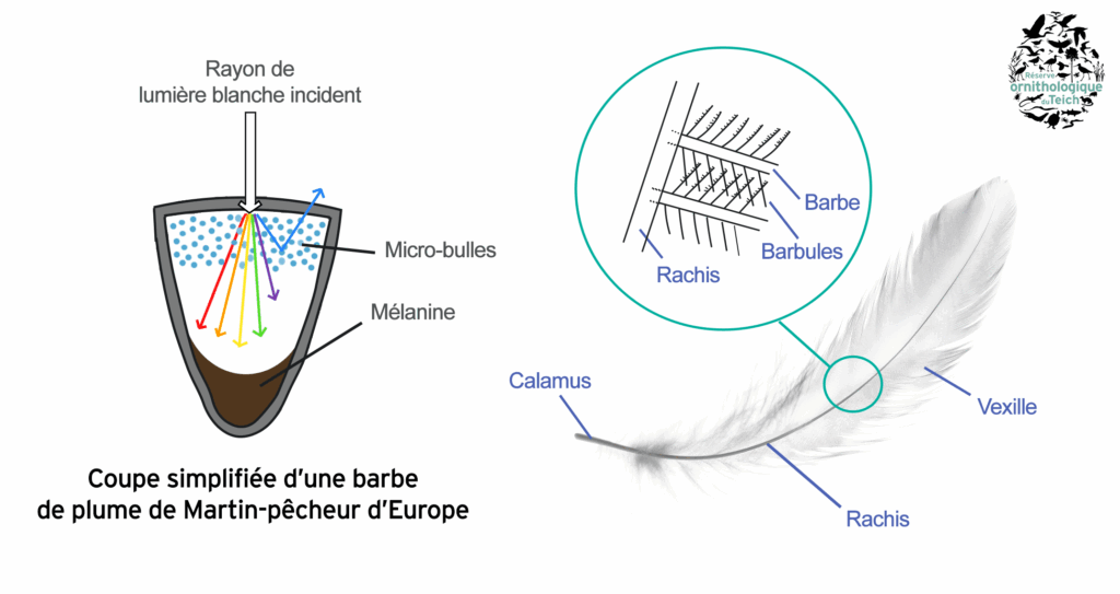 đȘ¶ Les plumes du Martin-pĂȘcheur d’Europe (Alcedo atthis) ne contiennent aucun pigment de couleur. Le bleu qu’on lui connaĂźt si bien vient de structures microscopiques qui dĂ©composent la lumiĂšre. Plus prĂ©cisĂ©ment, les micro-bulles dâair contenues dans les barbes et les barbules de ses plumes associĂ©es Ă une couche de mĂ©lanine sombre dispersent et absorbent les autres couleurs pour ne plus diffuser que des longueurs dâonde bleues. En rĂ©sulte un bleu irisĂ©, qui change de teinte selon la lumiĂšre.