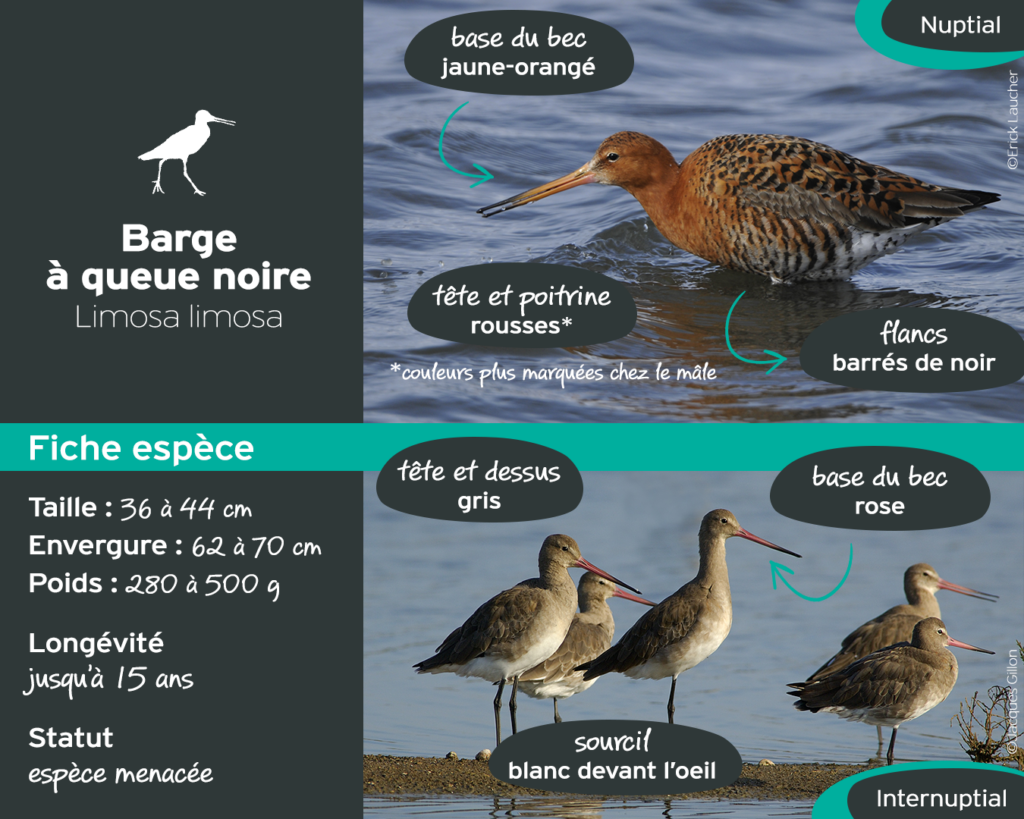 En migration postnuptiale, les Barges se rassemblent pour se déplacer, se nourrir et se reposer. Généralement plus importants au mois d’août, les groupes de passage dans la Réserve peuvent aller de quelques individus à plusieurs centaines d’oiseaux. Différencier les Barges à queue noire des Barges rousses peut s’avérer plus simple en plumage nuptial qu’en hiver.