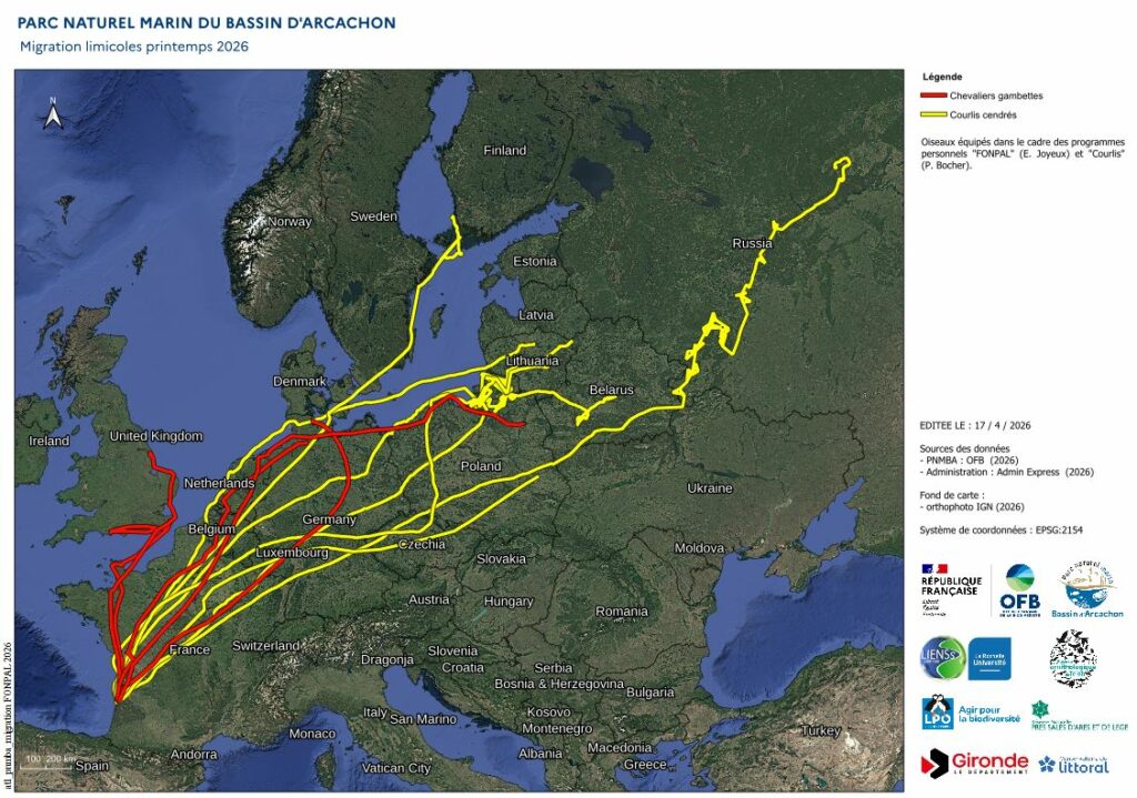 🔹 Après avoir passé l’hiver entre la Réserve du Teich et les plages de Gujan-Mestras, le Courlis cendré 317 a rejoint l’Estonie en passant par les côtes des Pays-Bas et la Lituanie.