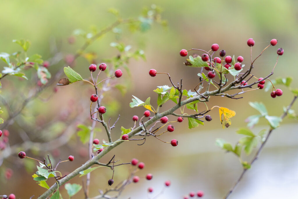 Certains arbrisseaux conservent leurs fruits jusqu’à tard dans la saison. Ce sont pour les oiseaux de précieuses sources de nutriments. Dans la réserve, les oiseaux peuvent profiter de la présence de mûres jusqu’en octobre. Ils passeront ensuite aux prunelles des prunelliers, qui sont un véritable cocktail d’antioxydants et de vitamine C. Il en va de même pour les cynorrhodons, ces petites baies rouges de l’églantier, ou pour les fruits de l’aubépine ou du houx. Plus tard dans la saison, ce sont les fruits particulièrement tardifs du lierre qui viendront offrir un répit alimentaire crucial pour les oiseaux frugivores.