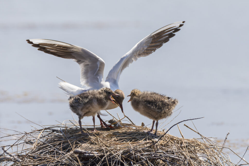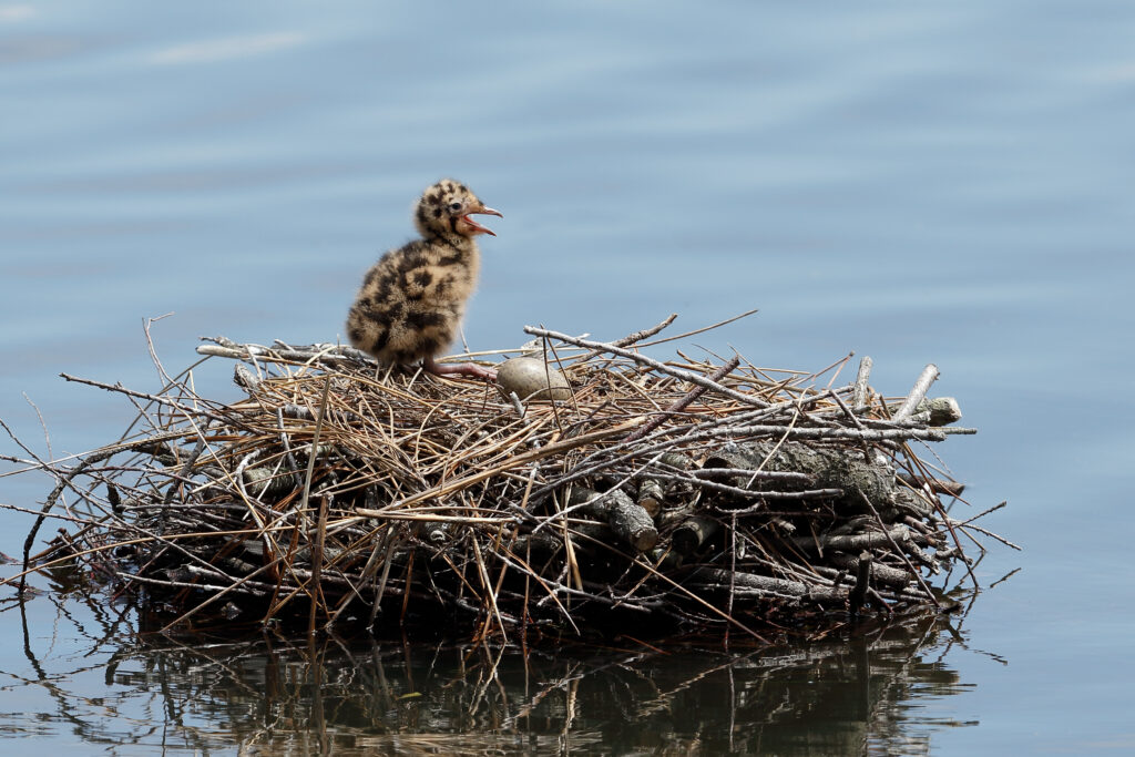 Les premières mouettes rieuses sont nées, du côté de l’observatoire 14. Avec plus de 30 nids occupés, pas facile de tenir à jour le calendrier des naissances ! Heureusement pour Carolanne et Juliette (chargées des suivis nidification cette année), des indices plutôt évidents permettent d’estimer l’âge des nouveau-nés.