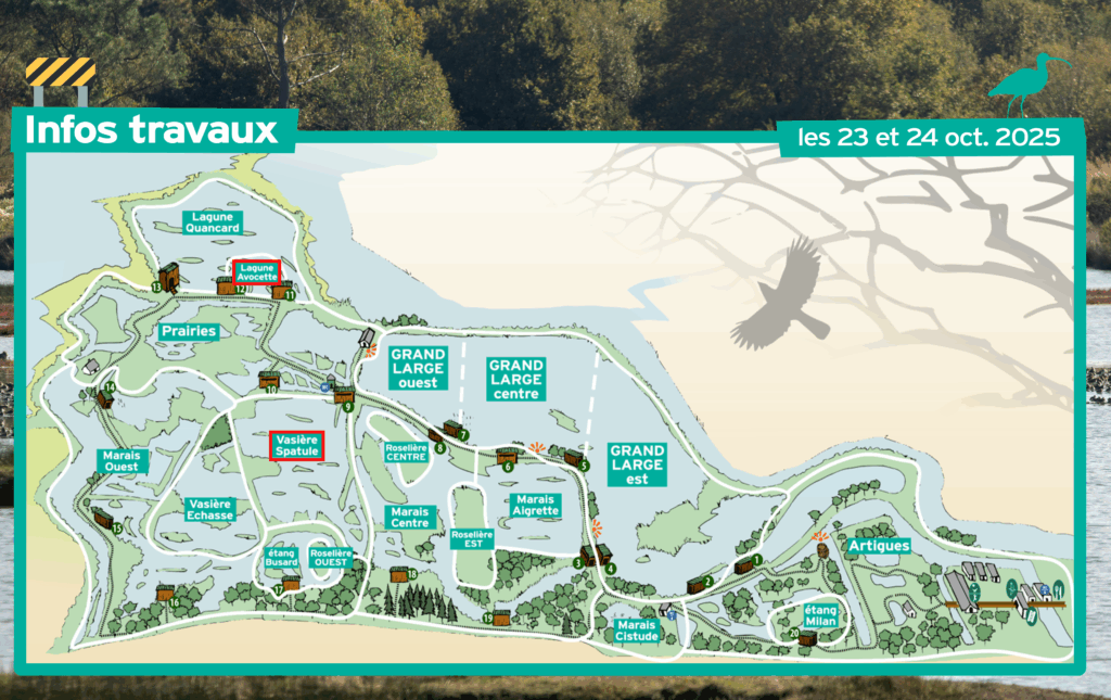 Pour permettre l’installation d’un nouvel ouvrage, les techniciens de gestion du site ont procédé à une baisse du niveau d’eau de la Vasière Spatule. Des interventions à la mini-pelle sont prévues aujourd’hui et demain pour la mise en place d’une écluse toute neuve.
